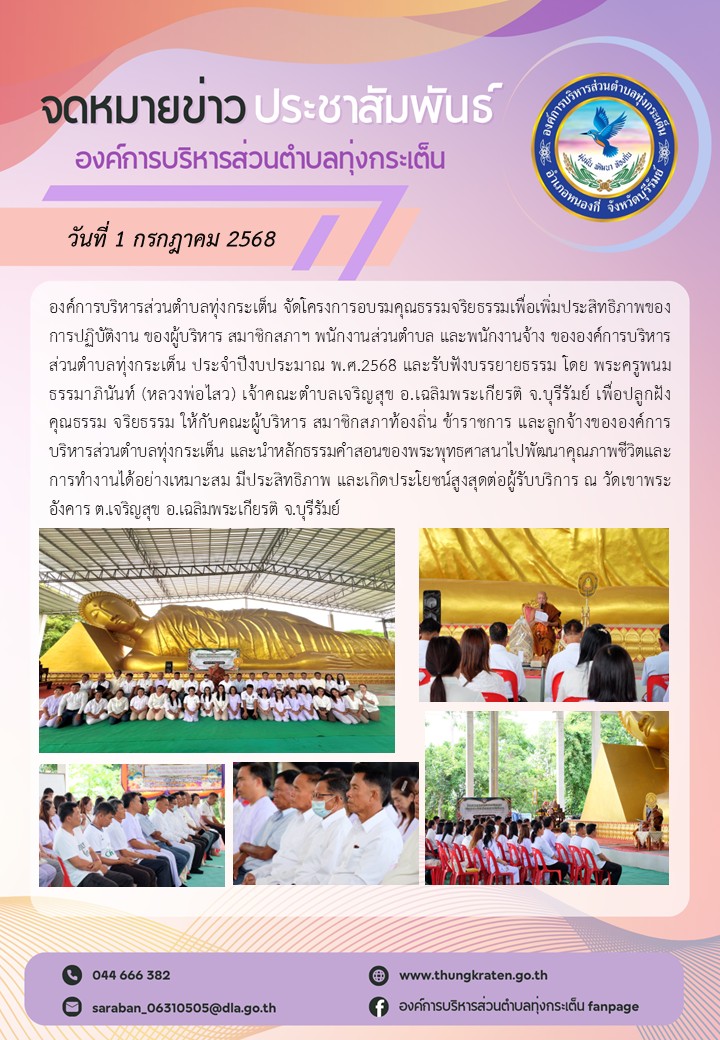 โครงการอบรมคุณธรรมจริยธรรมเพื่อเพิ่มประสิทธิภาพของการปฏิบัติงาน ของผู้บริหาร สมาชิกสภาฯ พนักงานส่วนตำบล และพนักงานจ้าง ขององค์การบริหารส่วนตำบลทุ่งกระเต็น ประจำปีงบประมาณ พ.ศ.2568