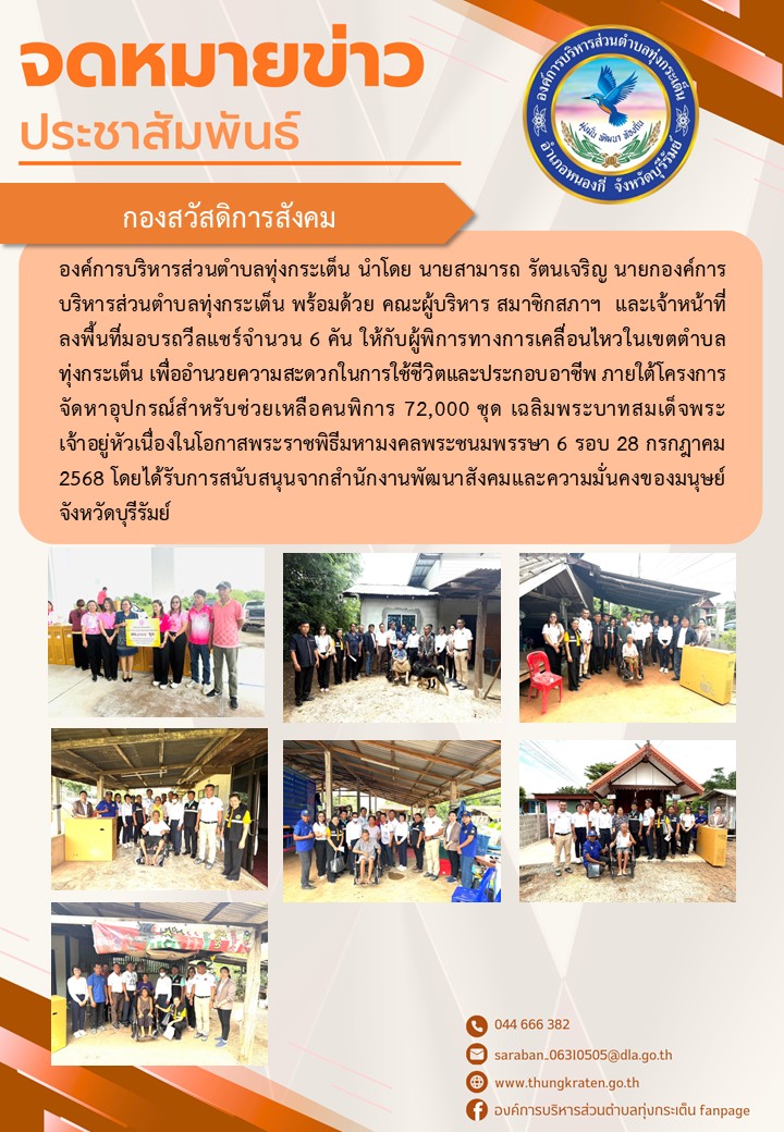 มอบรถวีลแชร์ให้กับผู้พิการทางการเคลื่อนไหวในเขตตำบลทุ่งกระเต็น ภายใต้โครงการจัดหาอุปกรณ์สำหรับช่วยเหลือคนพิการ 72,000 ชุด เฉลิมพระบาทสมเด็จพระเจ้าอยู่หัวเนื่องในโอกาสพระราชพิธีมหามงคลพระชนมพรรษา 6 รอบ 28 กรกฎาคม 2568
