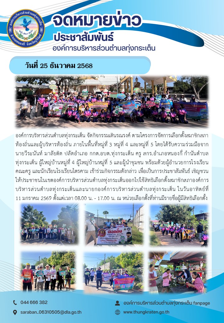 กิจกรรมเดินรณรงค์ ตามโครงการจัดการเลือกตั้งสมาชิกสภาท้องถิ่นและผู้บริหารท้องถิ่น ภายในพื้นที่หมู่ที่ 3 หมู่ที่ 4 และหมู่ที่ 5