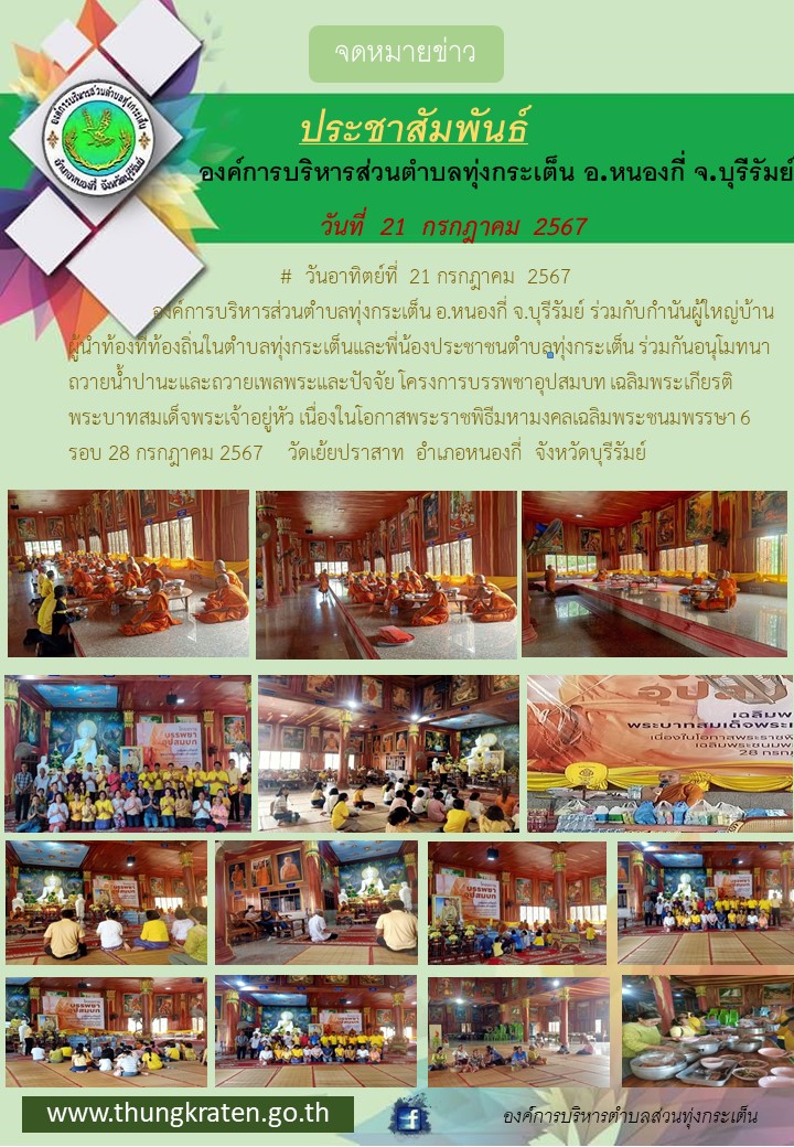 ผู้นำท้องที่ท้องถิ่นในตำบลทุ่งกระเต็นและพี่น้องประชาชนตำบลทุ่งกระเต็น ร่วมกันอนุโมทนาถวายน้ำปานะและถวายเพลพระและปัจจัย โครงการบรรพชาอุปสมบท เฉลิมพระเกียรติพระบาทสมเด็จพระเจ้าอยู่หัว