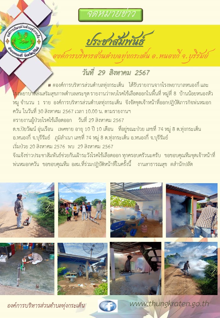 ออกให้บริการพ่นหมอกควันบริเวณรอบบ้านผู้ป่วยไข้เลือดออก หมู่ที่ 8