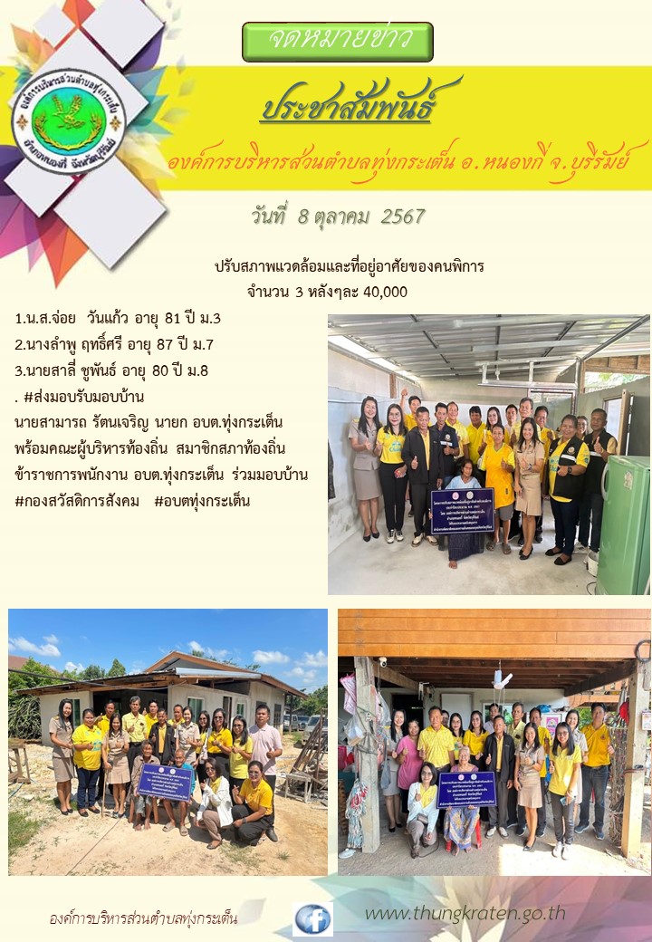 อบต.ทุ่งกระเต็นได้รับงบประมาณจากพัฒนาสังคมฯเพื่อปรับสภาพที่อยู่อาศัยคนพิการจำนวน 3 รายๆละ 40,000 บาท