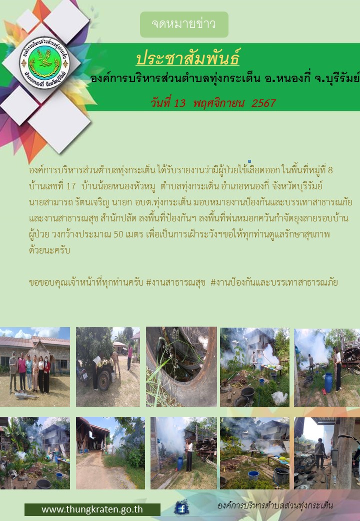 ออกให้บริการพ่นหมอกควันเพื่อกำจัดลูกน้ำยุงลาย บริเวณบ้านประชาชนป่วยเป็นโรคไข้เลือดออก หมู่ที่ 8