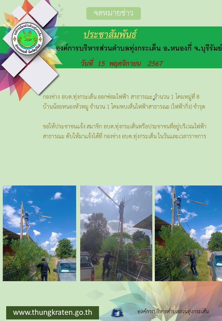 กองช่างออกให้บริการซ่อมไฟฟ้าสาธารณะในพื้นที่ตำบลทุ่งกระเต็น