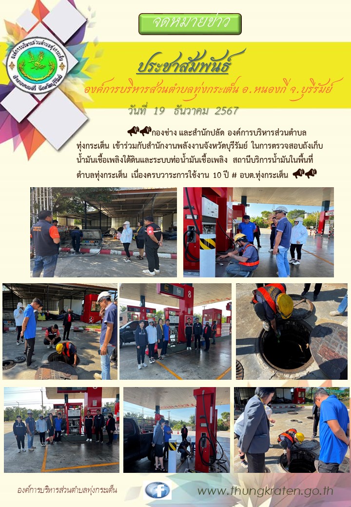 องค์การบริหารส่วนตำบลทุ่งกระเต็นร่วมกับสำนักงานพลังงานจังหวัดบุรีรัมย์ออกตรวจสอบถังเก็บนำ้มันเชื้อเพลิงใต้ดินและระบบท่อนำ้มันเชื้อเพลิงสถานีบริการนำ้มันเชื้อเพลิงในพื้นที่ตำบลทุ่งกระเต็น