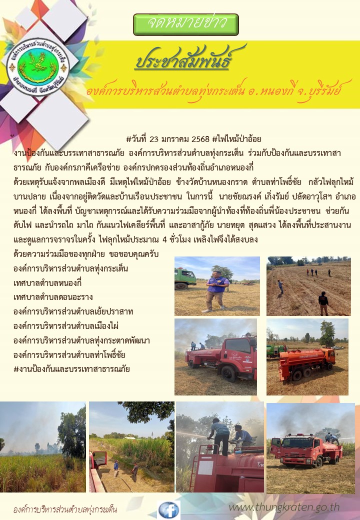 งานป้องกันและบรรเทาสาธารณภัยร่วมกับภาคีเครือข่ายออกระงับเหตุไฟไหม้ป่าอ้อยในพื้นที่ตำบลท่าโพธิ์ชัย