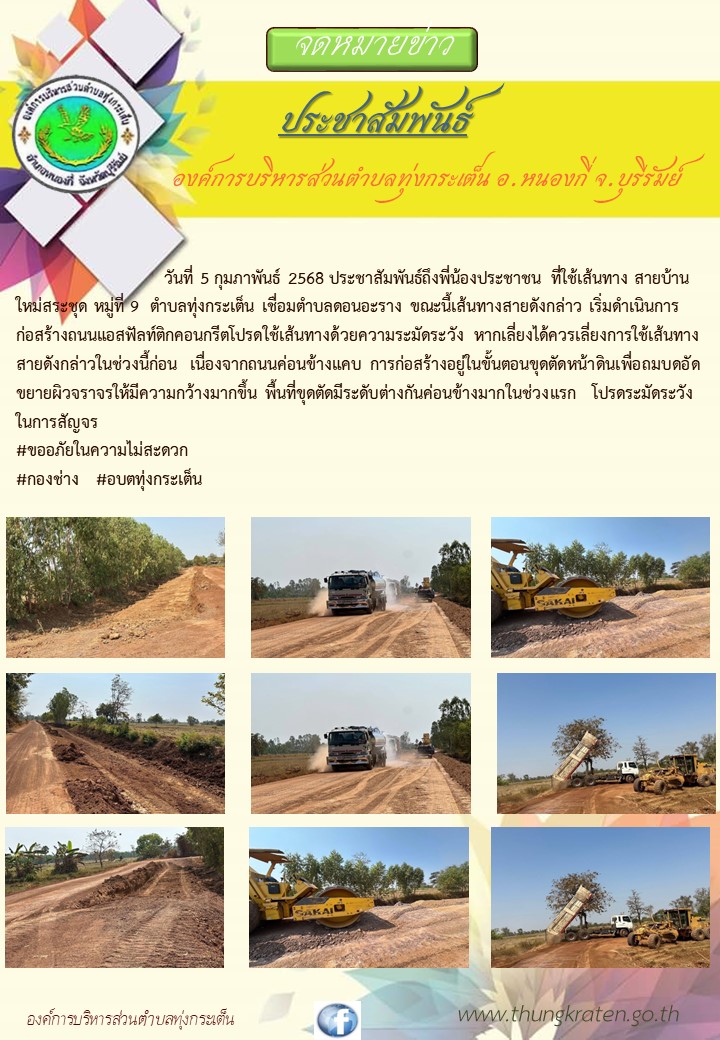 ประชาสัมพันธ์การใช้เส้นทางด้วยความระมัดระวังเนื่องจากมีการก่อสร้างถนนสาย หมู่ที่ 9 บ้านใหม่สระขุดเชื่อมตำบลดอนอะราง