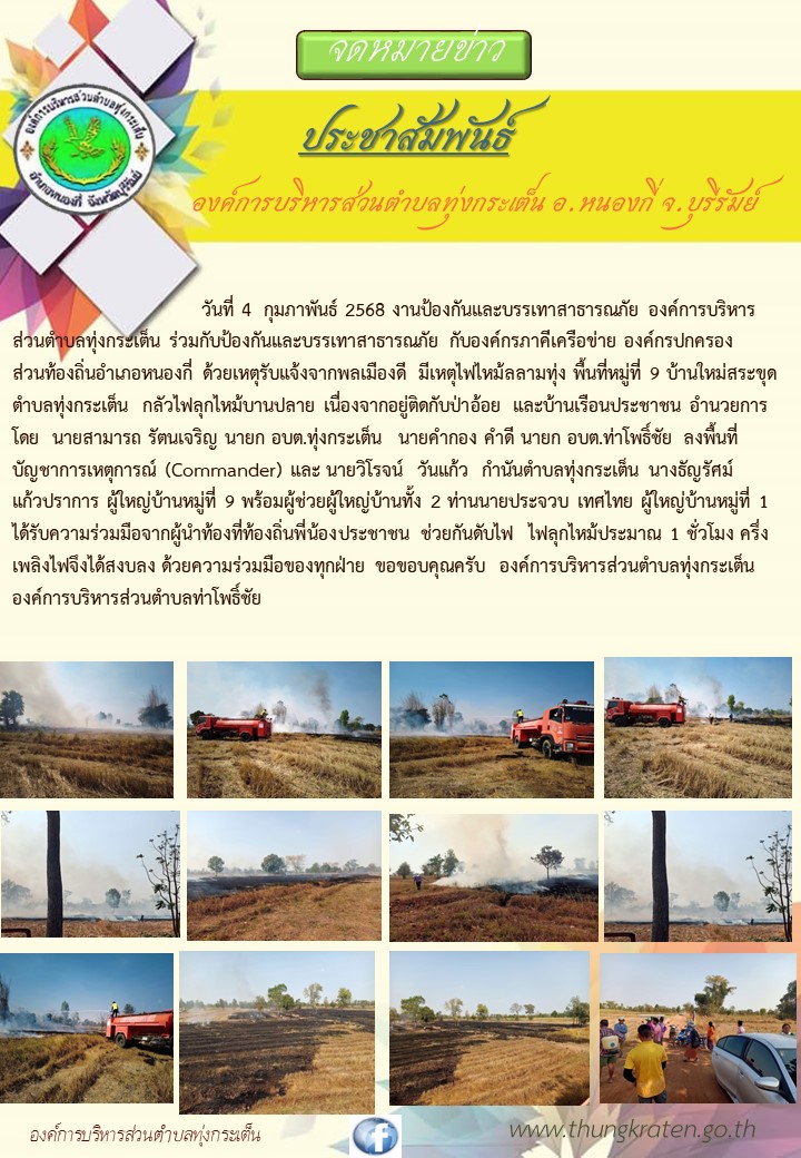 องค์การบริหารส่วนตำบลทุ่งกระเต็นร่วมกับองค์กรภาคีเครือข่ายร่วมระงับเหตุไฟไหม้ลามทุ่งบริเวณหมุ่ 9 บ้านใหม่สระขุด