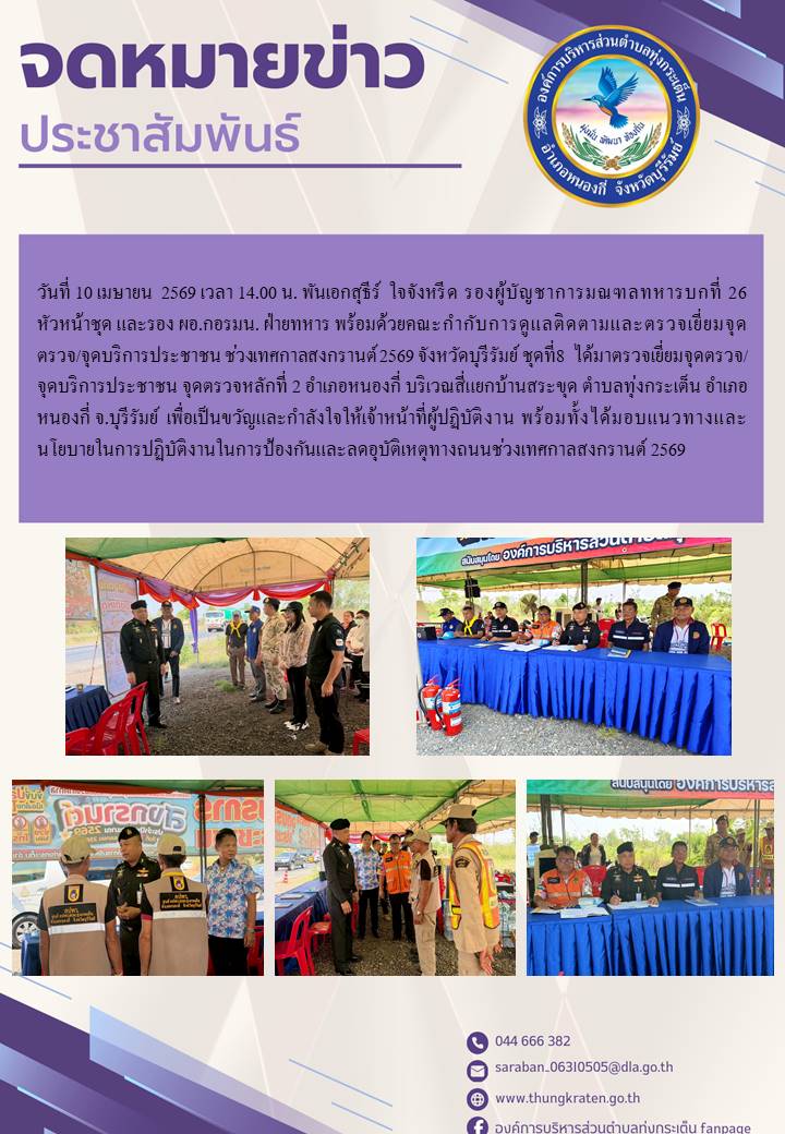 พร้อมทั้งมอบเครื่องดื่ม และสิ่งของต่างๆ เพื่อสนับสนุนการปฏิบัติงาน และเพื่อเป็นขวัญกำลังใจแก่ผู้ปฏิบัติงาน ณ จุดตรวจจุดบริการประชาชน ช่วงเทศกาลวันสงกรานต์ พ.ศ. 2569