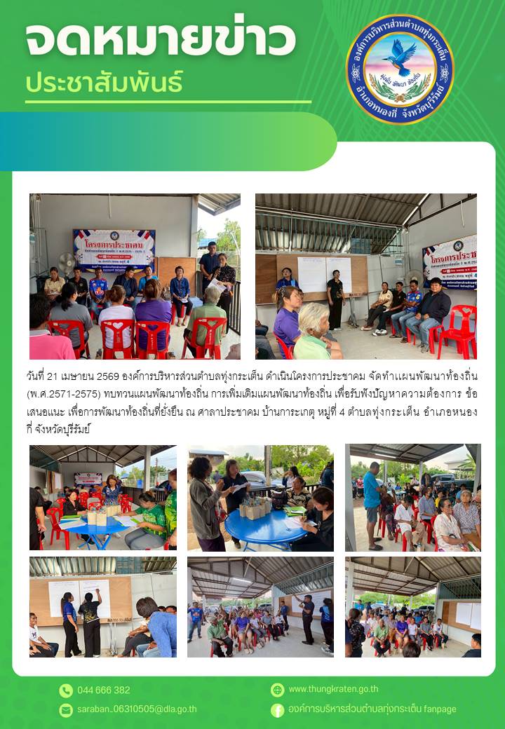 เพื่อรับฟังปัญหาความต้องการ ข้อเสนอเเนะเพื่อการพัฒนาท้องถิ่นที่ยั่งยืน ณ ศาลาประชาคมบ้านการะเกตุ หมู่ที่ 4 ตำบลทุ่งกระเต็น อำเภอหนองกี่ จังหวัดบุรีรัมย์