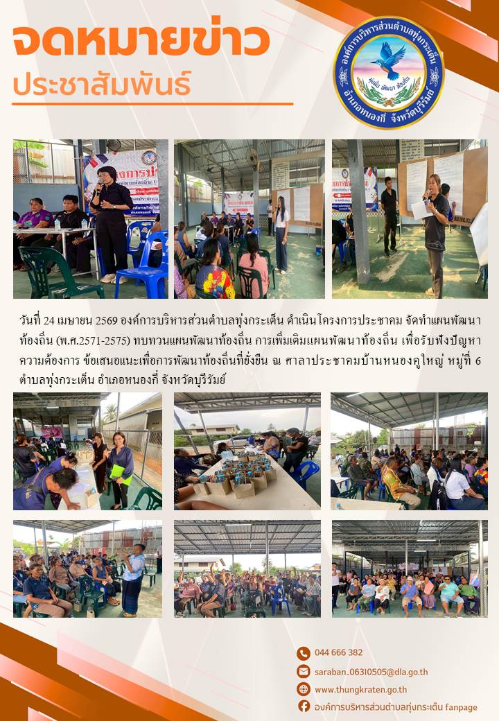 เพื่อรับฟังปัญหาความต้องการ ข้อเสนอเเนะเพื่อการพัฒนาท้องถิ่นที่ยั่งยืน ณ ศาลาประชาคมบ้านโคกสะอาด หมู่ที่ 7 ตำบลทุ่งกระเต็น อำเภอหนองกี่ จังหวัดบุรีรัมย์