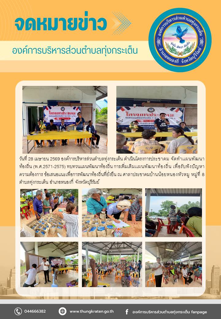 ข้อเสนอเเนะเพื่อการพัฒนาท้องถิ่นที่ยั่งยืน ณ ศาลาประชาคมบ้านน้อยหนองหัวหมู หมู่ที่ 8 ตำบลทุ่งกระเต็น อำเภอหนองกี่ จังหวัดบุรีรัมย์