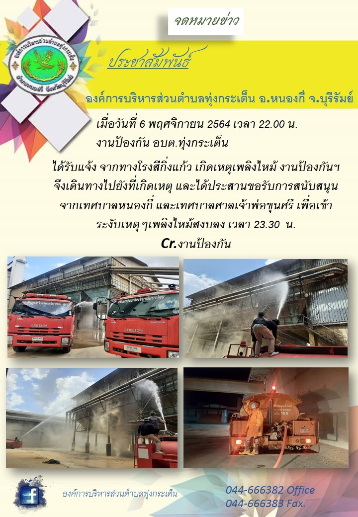 องค์การบริหารส่วนตำบลทุ่งกระเต็นออกระงับเหตุเพลิงไหม้โรงสีกิ่งแก้ว
