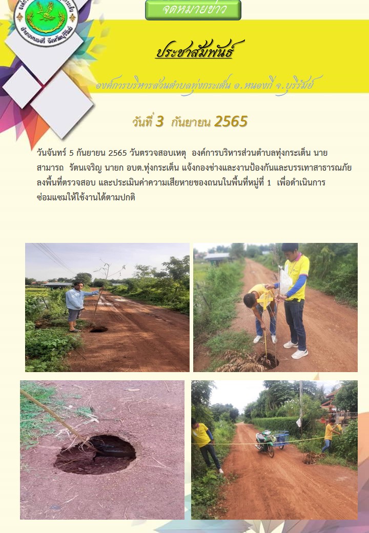 กองช่างและงานป้องกันและบรรเทาสาธารณภัย ลงพื้นที่ตรวจสอบ และประเมินค่าความเสียหายของถนนในพื้นที่หมู่ที่ 1