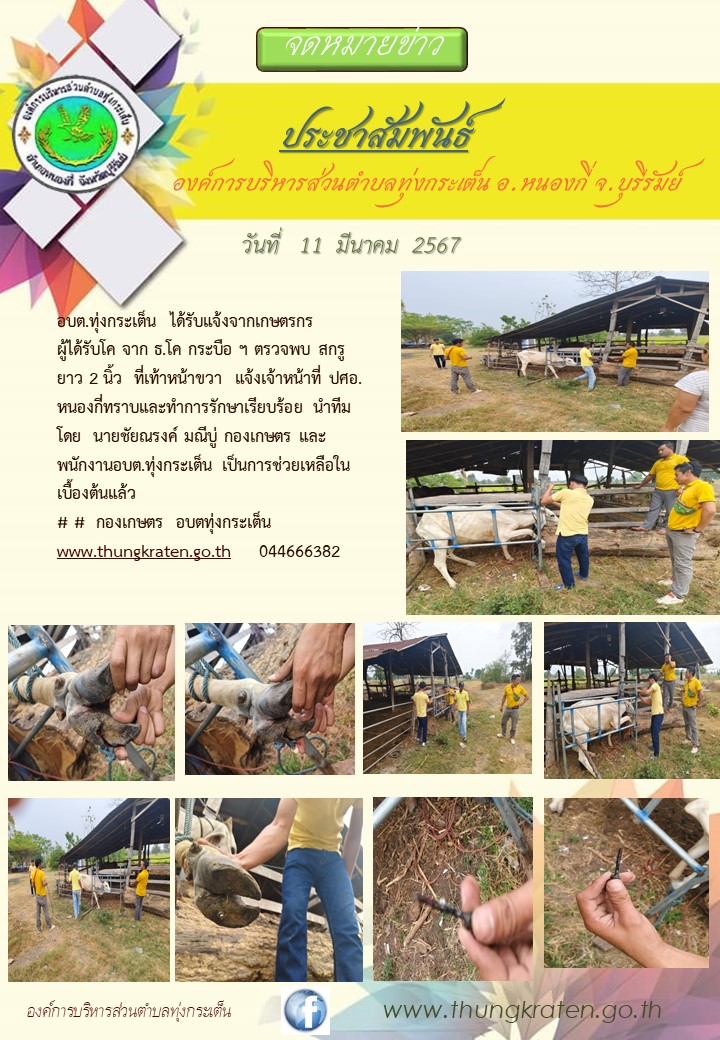 เจ้าหน้าที่ ปศอ.หนองกี่ทำการรักษา โค กระบือ ฯ เหยียบสกรู ยาว 2 นิ้ว ที่เท้าหน้าขวา