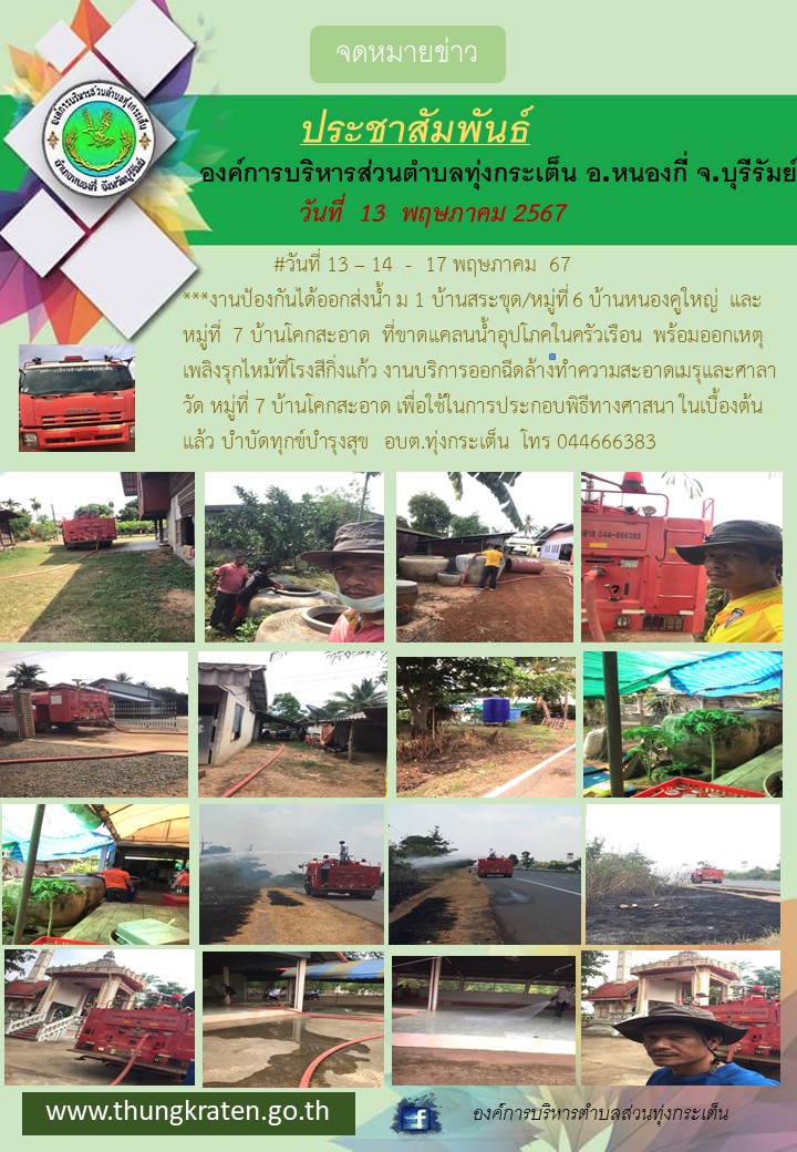 งานป้องกันออกให้บริการนำ้อุปโภค ออกเหตุระงับเพลิงไหม้ และให้บริการสาธารณะในรอบเดือน พฤษภาคม 2567